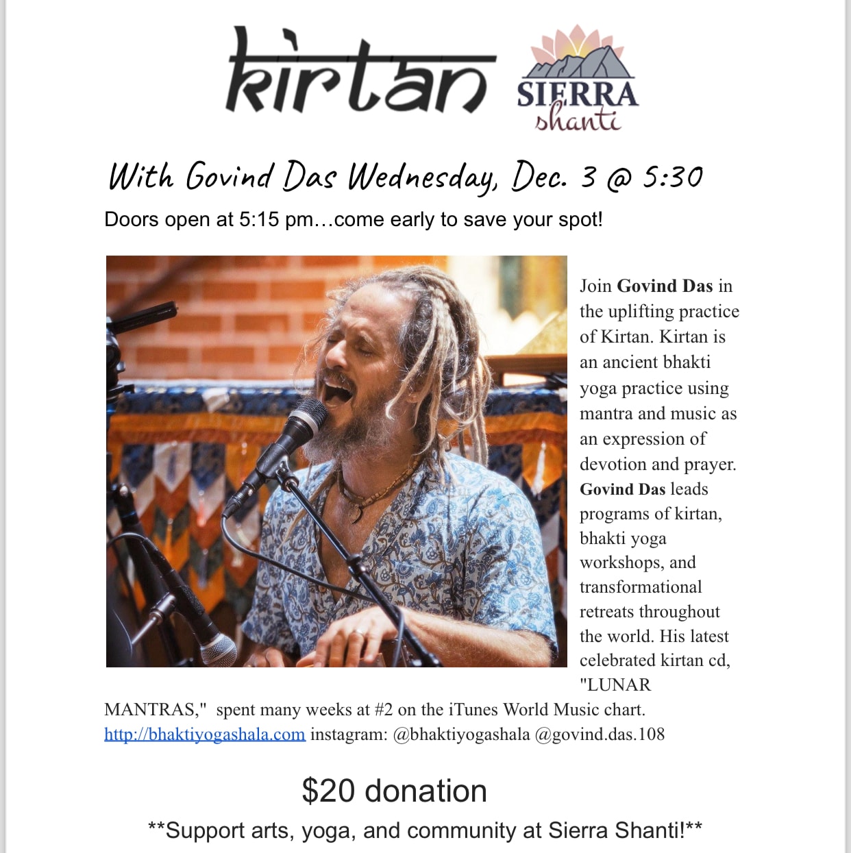 Join Govind Das in the uplifting and heart opening practice of Kirtan. Kirtan is an ancient bhakti yoga practice using mantra and music as an expression of devotion and prayer. The literal translation of kirtan is "to praise." Kirtan is described as a "jewel of a spiritual practice" because of its joyful, open-hearted, meditative, and communal feeling. Come sing, dance, and enjoy spiritual community. For the new people to kirtan/chanting, just bring yourself, no special clothes or yoga mat needed.Class Price